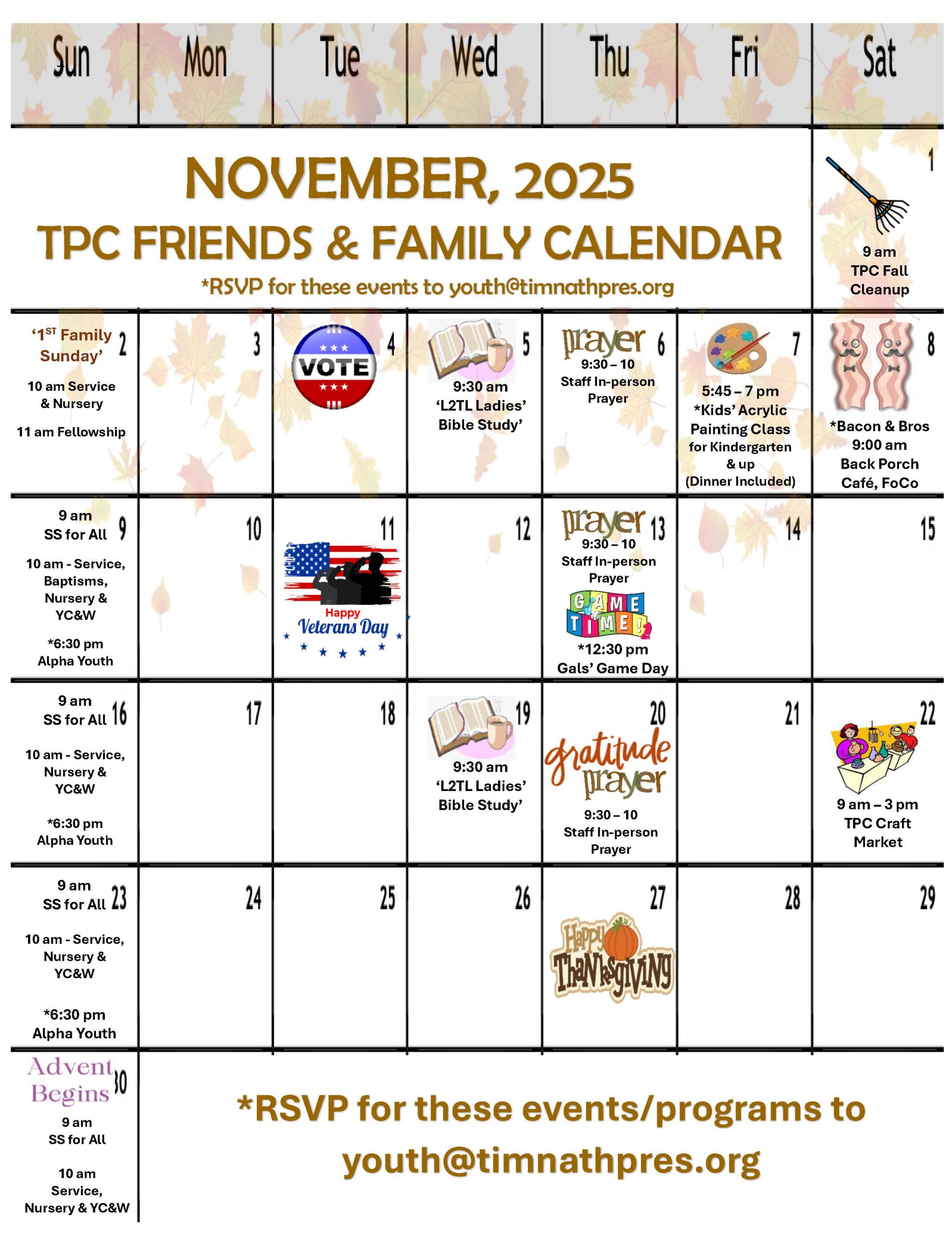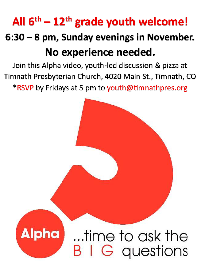 6th-12th grade youth are welcome to join us Sundays in November. Please RSVP by Fridays to Diane youth@timnathpres.org