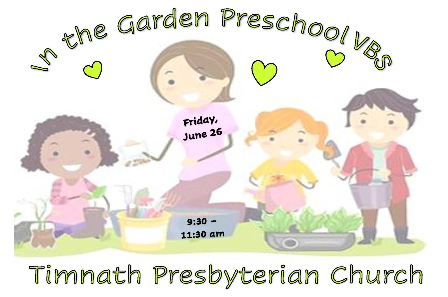 In the Garden Preschool VBS is 9:30 – 11:30 am, Fri, June 26th (potty-trained preschool only).